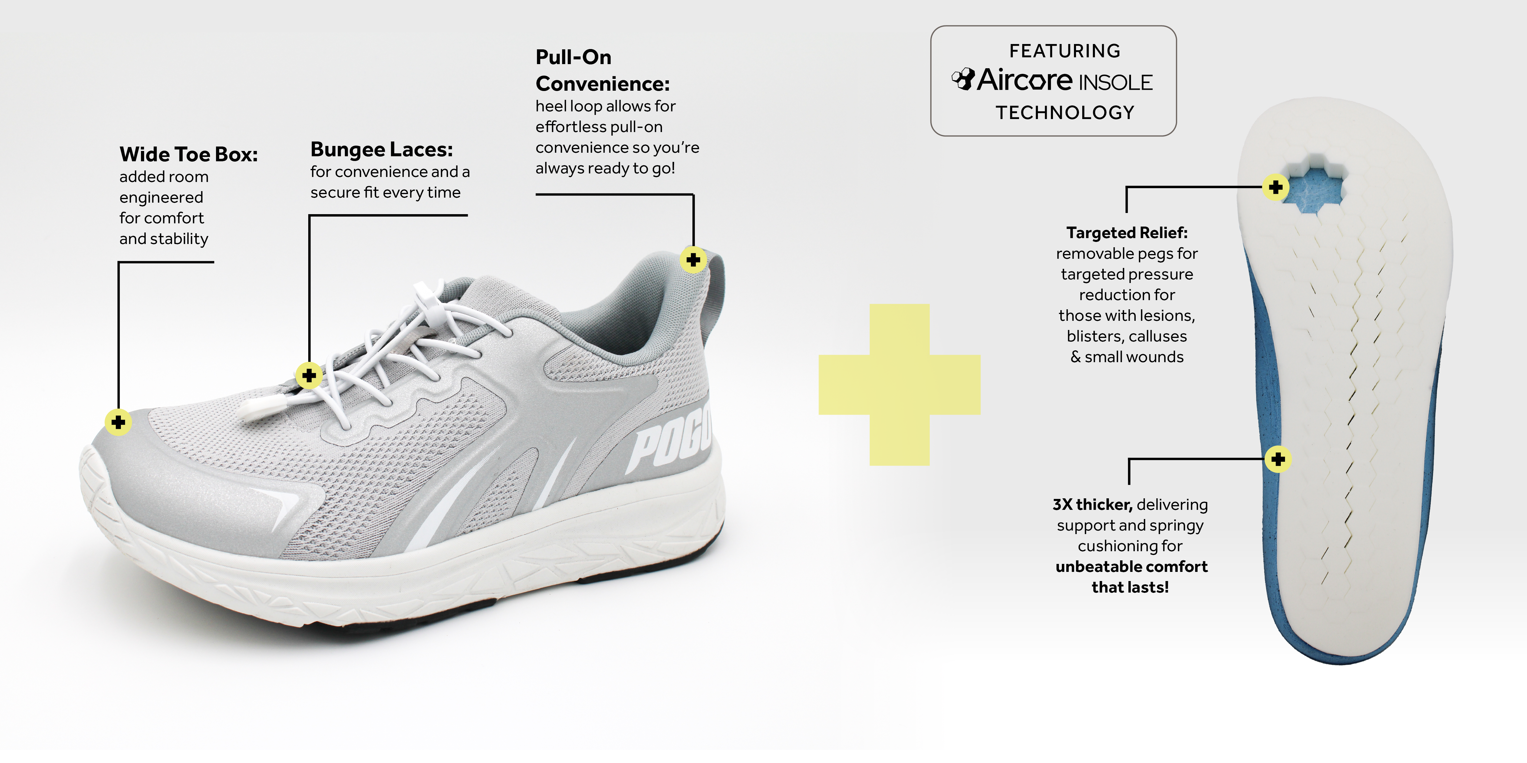 Step into superior comfort with POGO®. Engineered from the insole out, it’s the only athletic shoe featuring Aircore™ Insoles by DARCO—three times thicker than standard insoles for enhanced rebound, cushioning, and all-day comfort. An innovative removable peg system allows you to create a custom offloading zone tailored to your needs, reducing pressure and maximizing relief where you need it most. Engineered for extended wear, POGO® is as healthy on the inside as it is stylish on the outside, delivering the perfect blend of performance and support.
